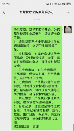 为保证新学期大宗物资配送安全、及时,负责人联系各供应商负责人做好新学期消杀、备货查验、台账记录等工作。